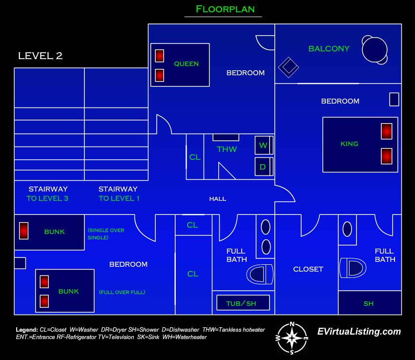 As you enter, you’ll find a beautifully furnished living space with all the comforts of home. The 2nd level features a cozy master bedroom en-suite with a King bed, a large walk-in closet, and a beautiful master bath. A convenient slider provides access to your cozy covered balcony for your early morning coffee. On the same level, you will find a second bedroom with a Queen bed and access to the cozy balcony as well. The 3rd bedroom features two bunk beds (One full over full and the other single over single). Another full bathroom with a shower/tub combo and a laundry room complete this level.