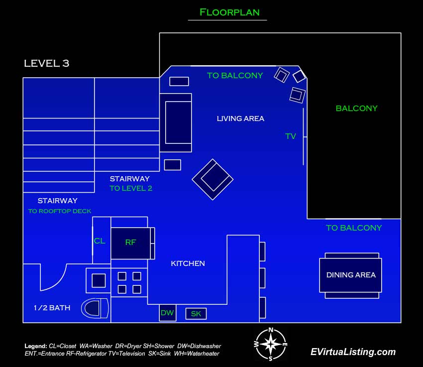 On the 3rd level, you will be stunned when you see the bright and open living space with sliders to your wrap-around deck. You will enjoy a fully equipped kitchen with modern appliances, including a dishwasher, microwave, coffee maker, toaster, and blender. Your convenient guest bathroom is across from the stairwell. Central AC ensures that you stay cool and comfortable throughout your stay.